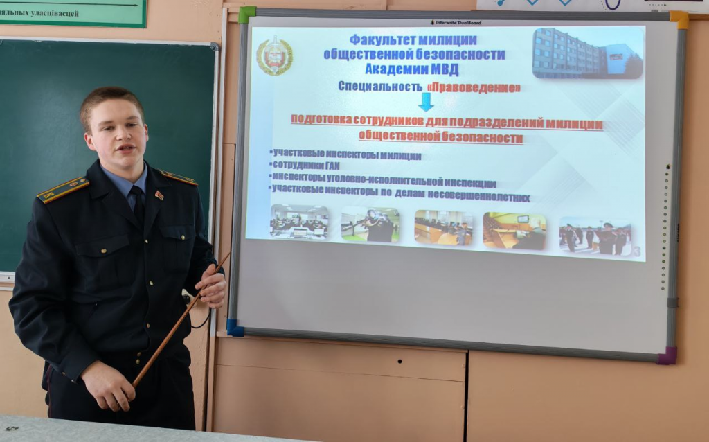 Будущий офицер познакомил ребят со спецификой обучения в Академии МВД. Учащиеся были ознакомлены со специальностями и специализациями Академии МВД, условиями подготовки курсантов, спецификой и перспективой службы выпускников в подразделениях органов внутренних дел и других силовых структурах Беларуси, понятиями офицерского долга и чести. Ребята получили исчерпывающие ответы на все вопросы, связанные с поступлением в Академию МВД, с особенностями обучения и проживания.