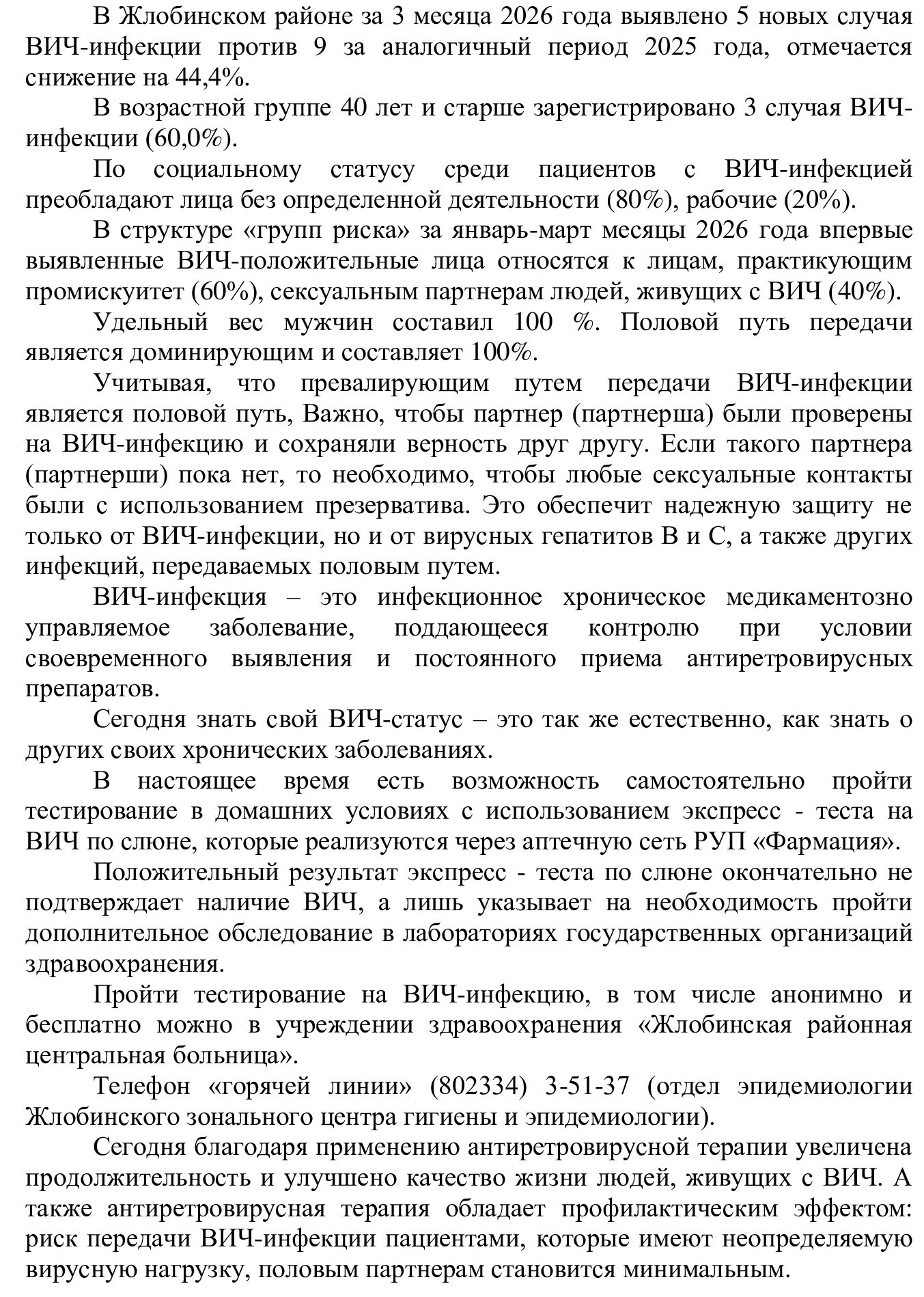 Эпидситуация по ВИЧ-инфекции в Жлобинском районе на 01.04.2026 год